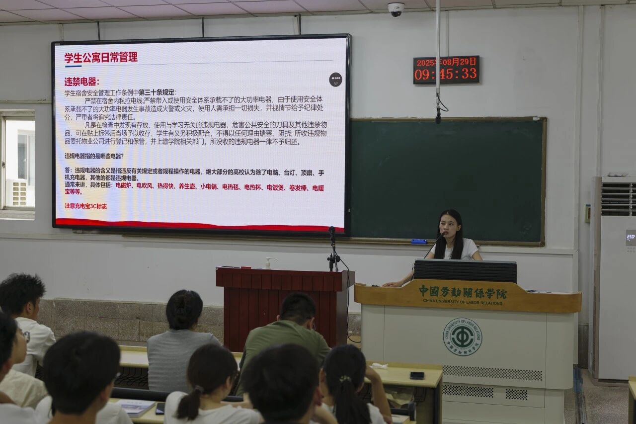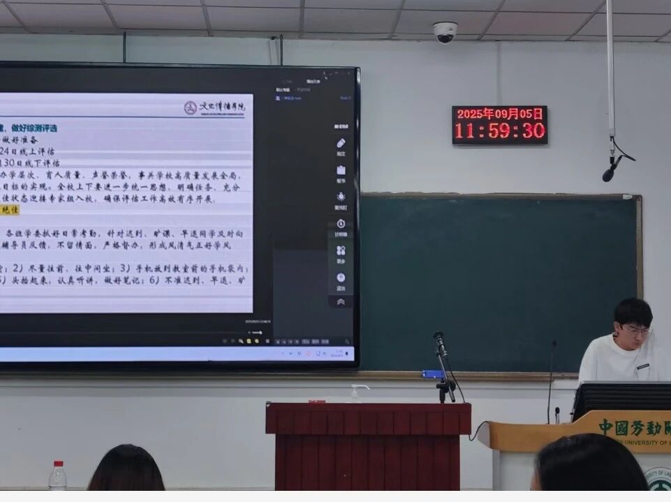 2025级新生入学伊始,为准确部署大一年级整体工作方向,明晰新学期核心任务,杨洋老师召开了2025年秋季学期第一次年级大会,向大家详细介绍了教学评估、学风建设与宿舍安全管理三个方面。