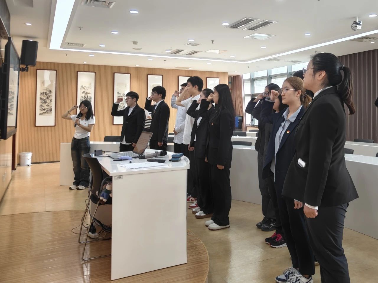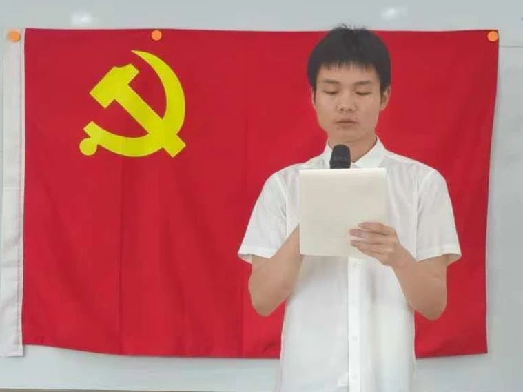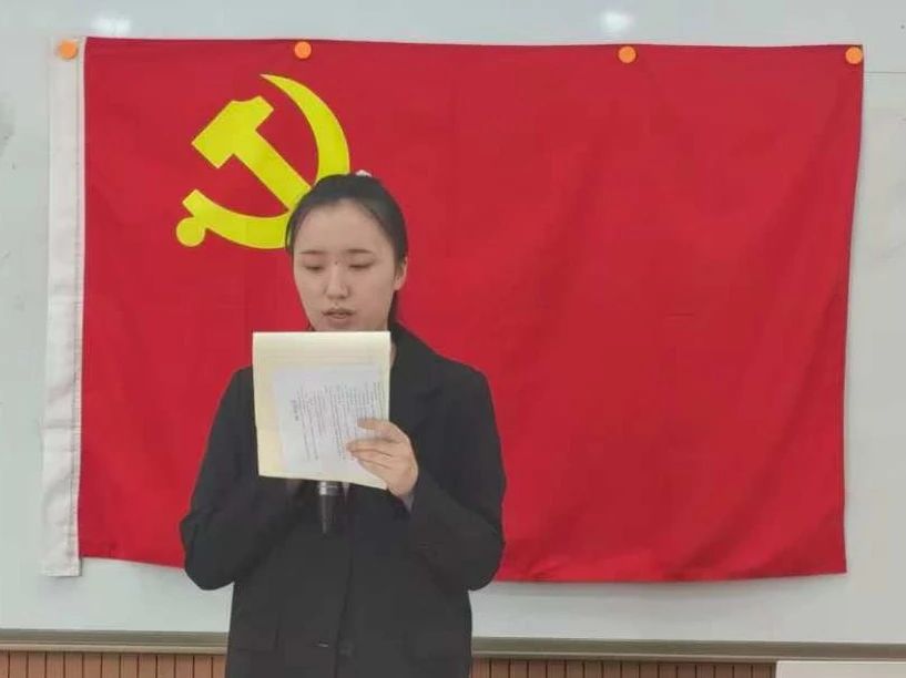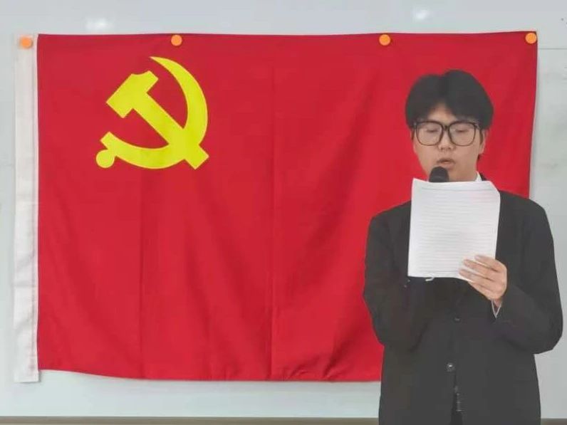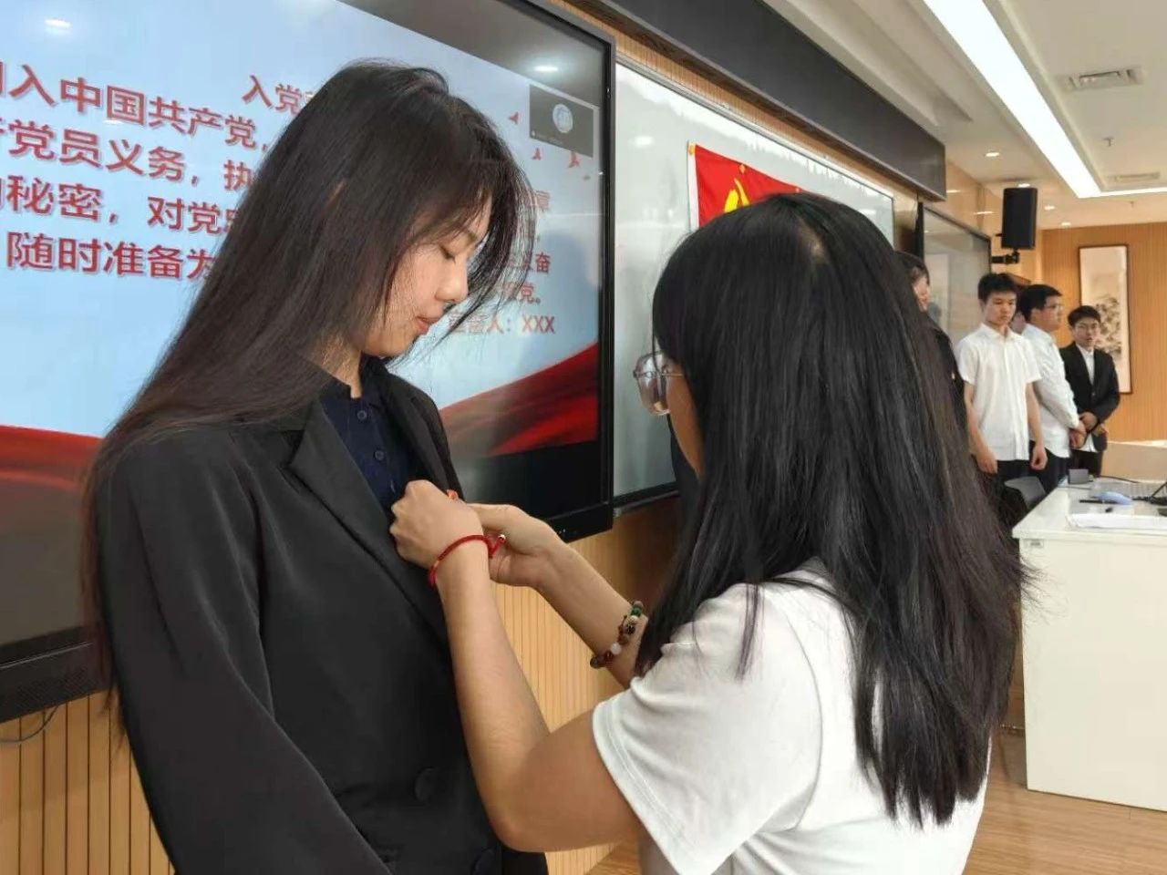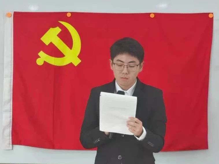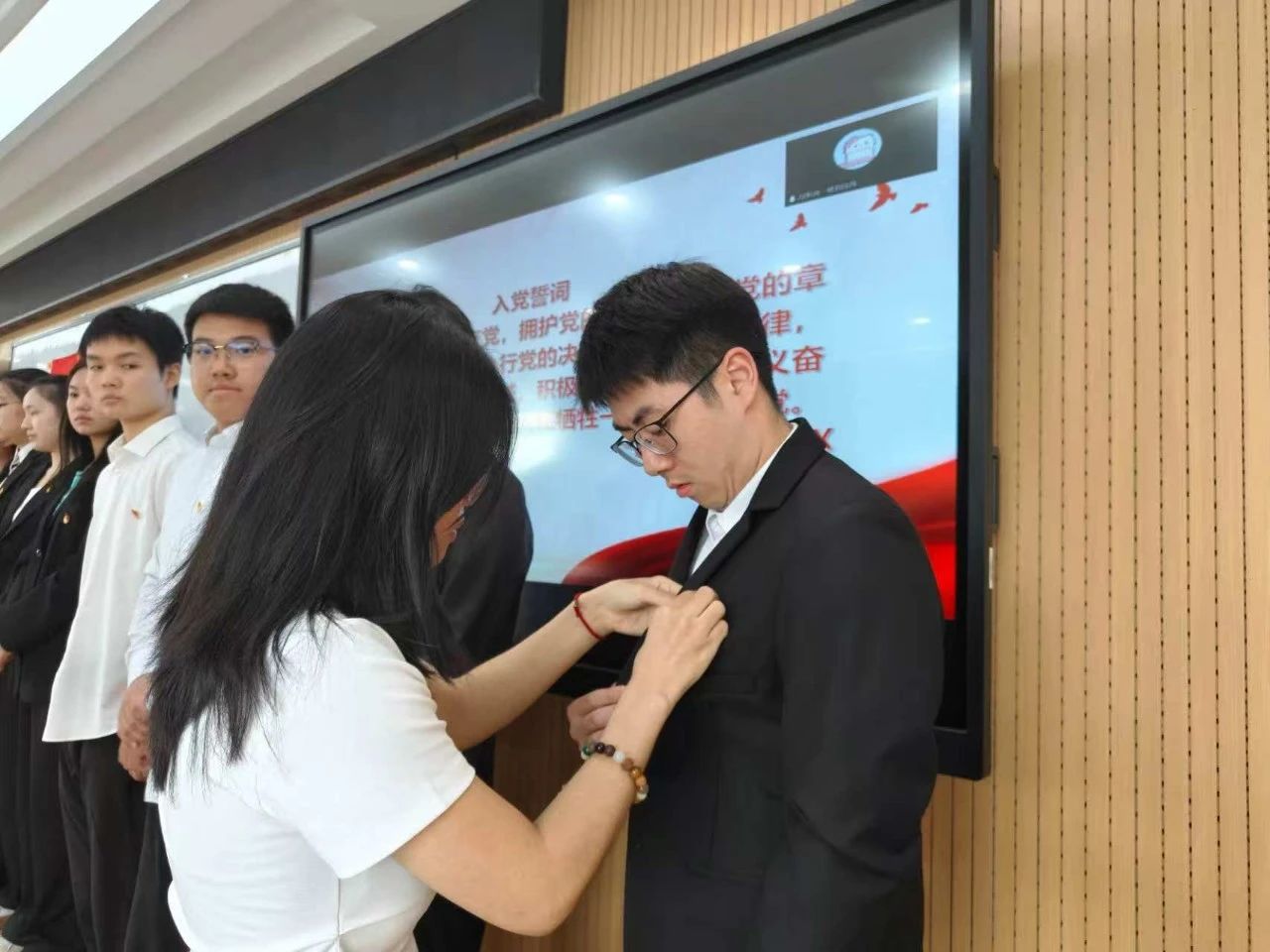 随后,学生党支部学生党员代表张小闯同志为新发展党员佩戴党徽,并带领新发展党员宣读入党誓词。
