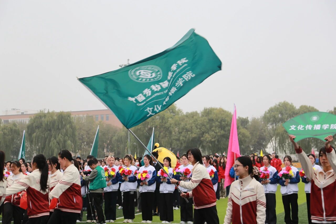 文化传播学院的方阵代表队入场。伴随着响彻云霄的口号,他们手持国旗,步伐有力,朝气蓬勃,意气风发,彰显着文化传播学院昂扬向上,同心协力的精神风貌。