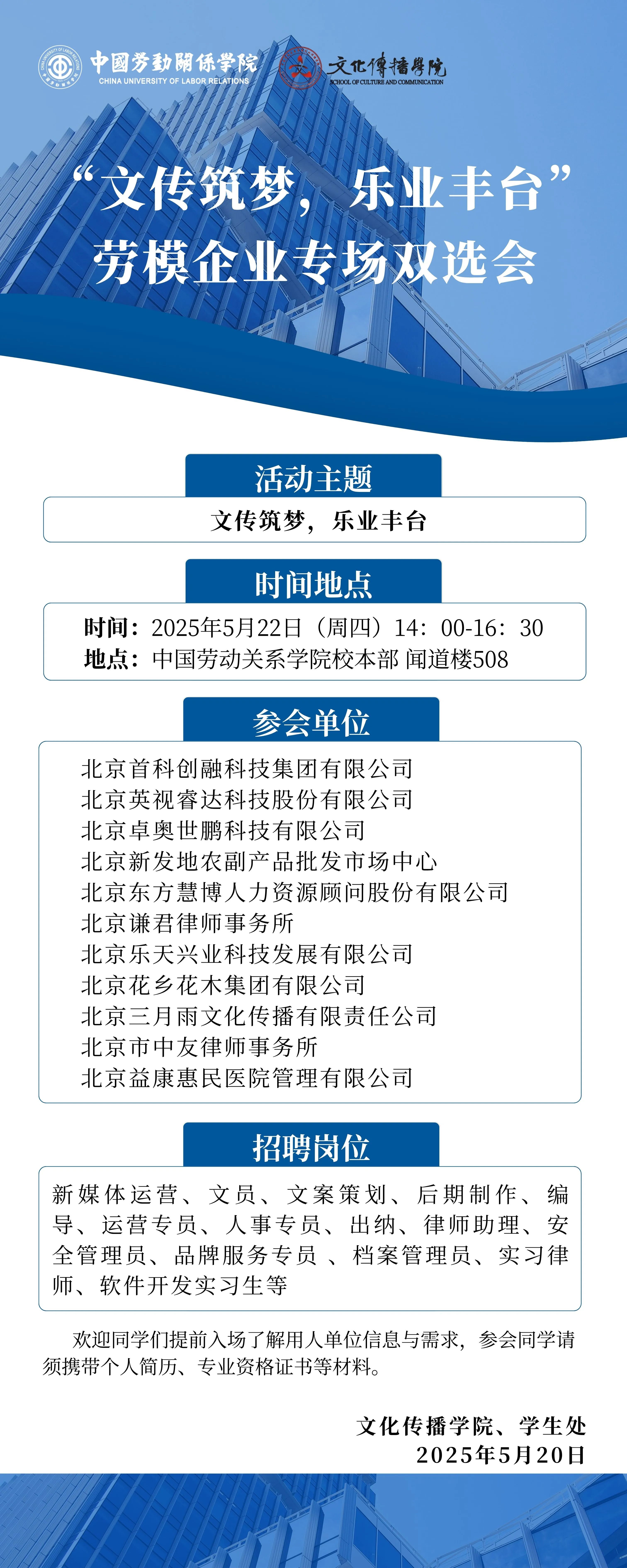 为贯彻落实教育部关于促进高校毕业生高质量就业的工作要求,充分发挥学科特色优势,搭建与地方工会深度融合的人才供需对接平台,文化传播学院、学生处联合丰台区总工会举办丰台劳模企业专场双选会。现将有关事项通知如下。