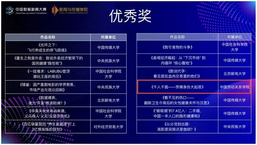 近日,第十届中国数据新闻大赛暨首届AIGC应用大赛北京市赛决赛评审结果出炉,中国劳动关系学院学子凭借扎实的专业素养与出色的团队协作,在第十届中国数据新闻大赛中斩获荣誉。其中,文化传播学院学生董昱君、杨清然、宋昊泽在张雪静老师的指导下通过作品《千人千面——劳模身份大起底》荣获优秀奖。