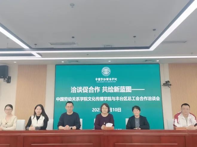 2025年3月10日,中国劳动关系学院文化传播学院与丰台区总工会合作洽谈会于致远楼509顺利举行。丰台区总工会组织人事部门有关人员一行到我院开展合作洽谈,文化传播学院院长王翠艳、党总支副书记张乃佳及部分老师参与会议。