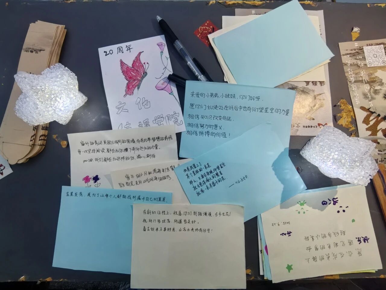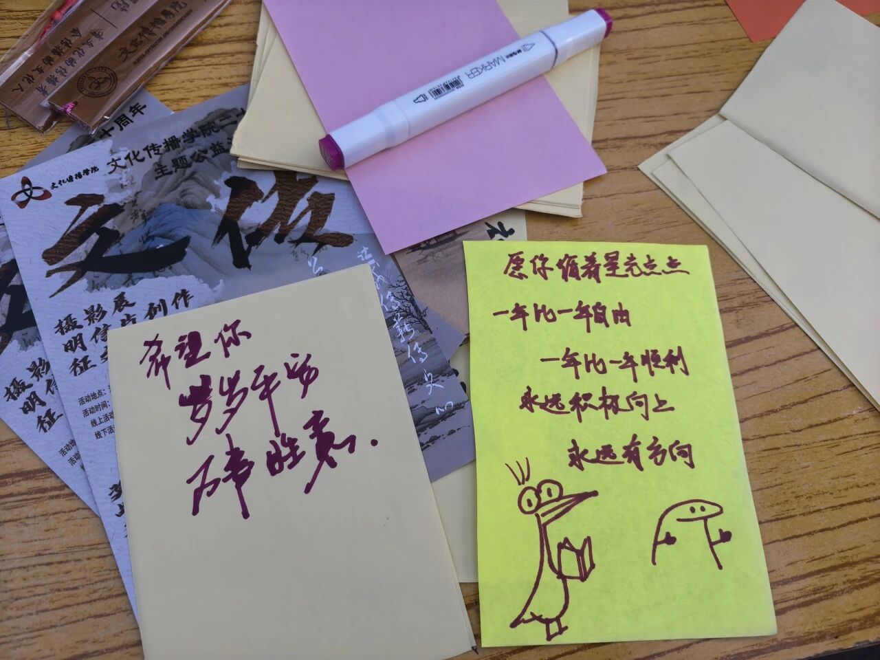 一笔一画,皆是情谊绵长;方寸之间,自有天地宽广。同学们或于空白明信片上自由挥洒,以斑斓色彩勾勒文传二十载的岁月画卷;或选取印有学院印记的主题明信片,在片纸背后以手写心意,静静诉说对师恩的感激、对同窗的寄语、对学院明天的殷殷期盼。这小小一笺,承载的不仅是笔墨色彩,更是绵延不绝的文传记忆与真挚如初的青春情怀。