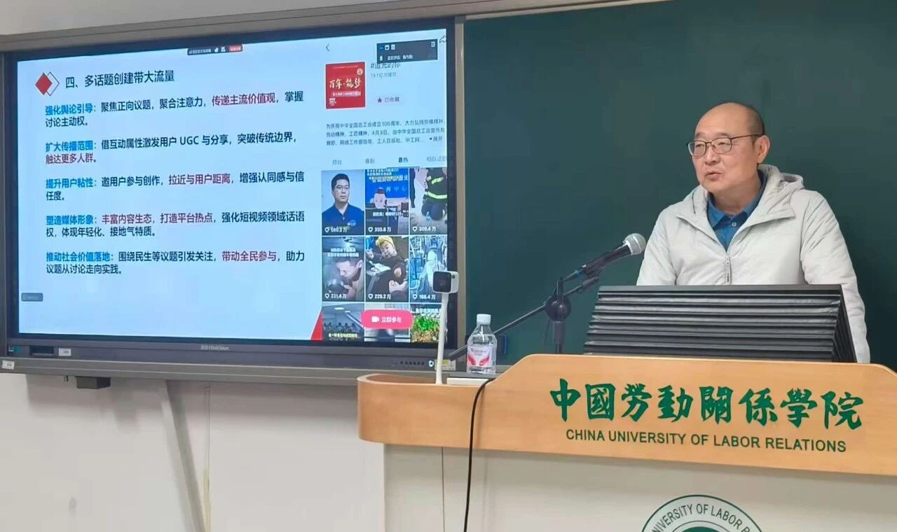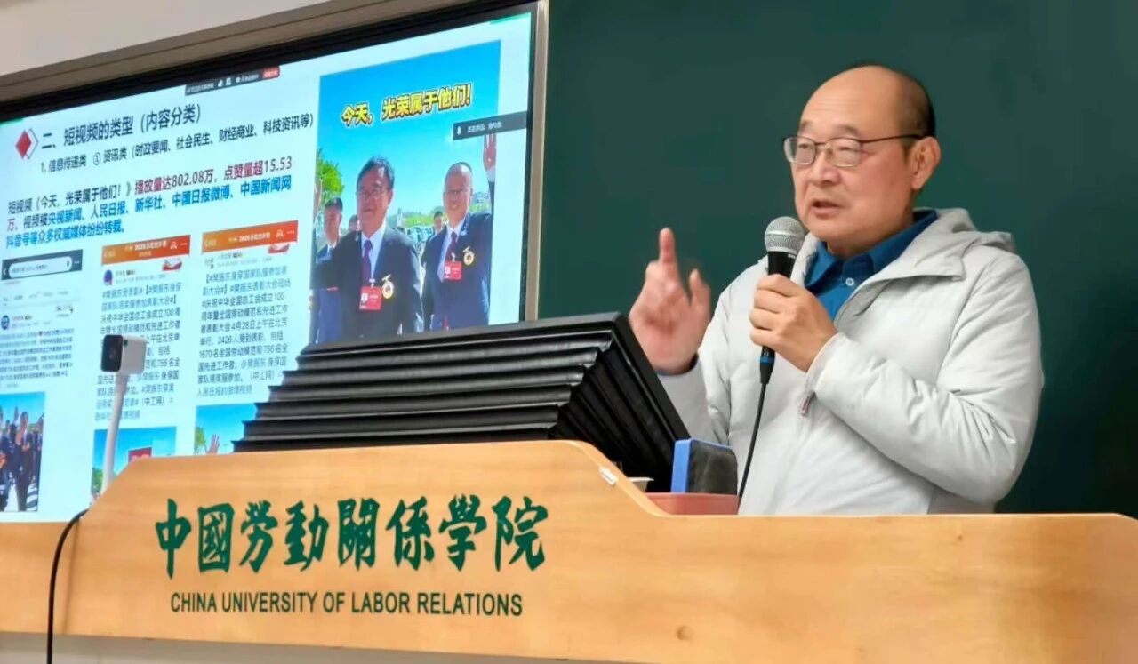 2025年12月18日晚,中国劳动关系学院文化传播学院主办的增光传媒前沿论坛专题讲座,以“线上+线下”结合的形式在北京校区闻道楼409室及腾讯会议平台同步举行。本次讲座以“短视频的全流程策划和制作”为题,由工人日报社编委及经济部主任、高级编辑王金海老师主讲,文化传播学院院长王翠艳老师主持,学院教师代表、全体在校研究生参加。讲座还吸引了复旦大学、中国科学院大学等外校师生云参与。