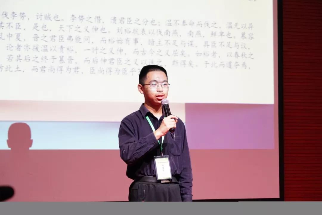 在经史策问环节,我校派出学识渊博的王广益同学,此题要求选手结合儒学经典《四书集注》与古代历史案例,对王夫之《读通鉴论》的史学理论命题进行评析,王广益同学旁征博引,富有逻辑地分析了一人之正义,一时之正义与古今之通义之间的关系,辩论颇有气势。