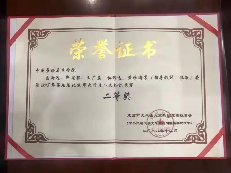 11月29日下午,第九届北京市大学生人文知识竞赛决赛在北京语言大学落下帷幕。由我校文传播学院匡济远、靳思骐、黄雅、孙修远和法学院王广益同学代表中国劳动关系学院参赛队突出重围,在高手如林的比赛中获得了二等奖的佳绩。