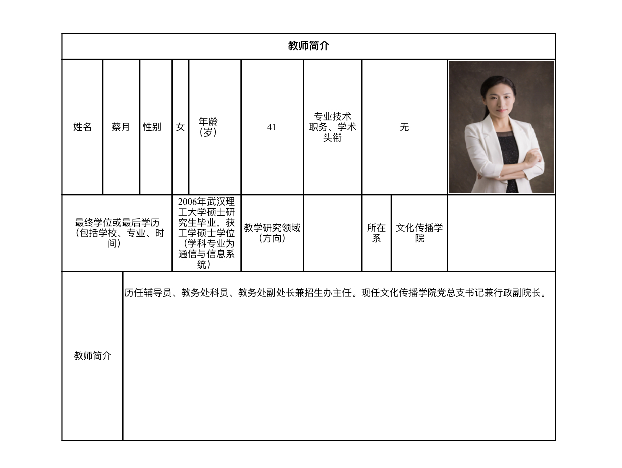 蔡月 文化传播学院党总支书记、行政副院长、主管文化传播学院党务、行政、学生管理工作。