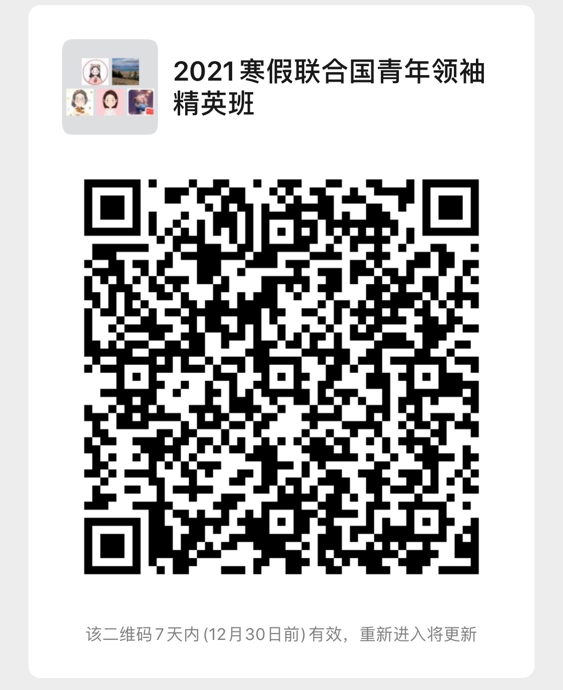 为便于后续工作的联系,请上述同学今日内扫描下方二维码加入微信群 “2021寒假联合国青年领袖精英班”,并将群名称改为“姓名-所属院系和专业”的形式。注:该群仅限上述同学加入。