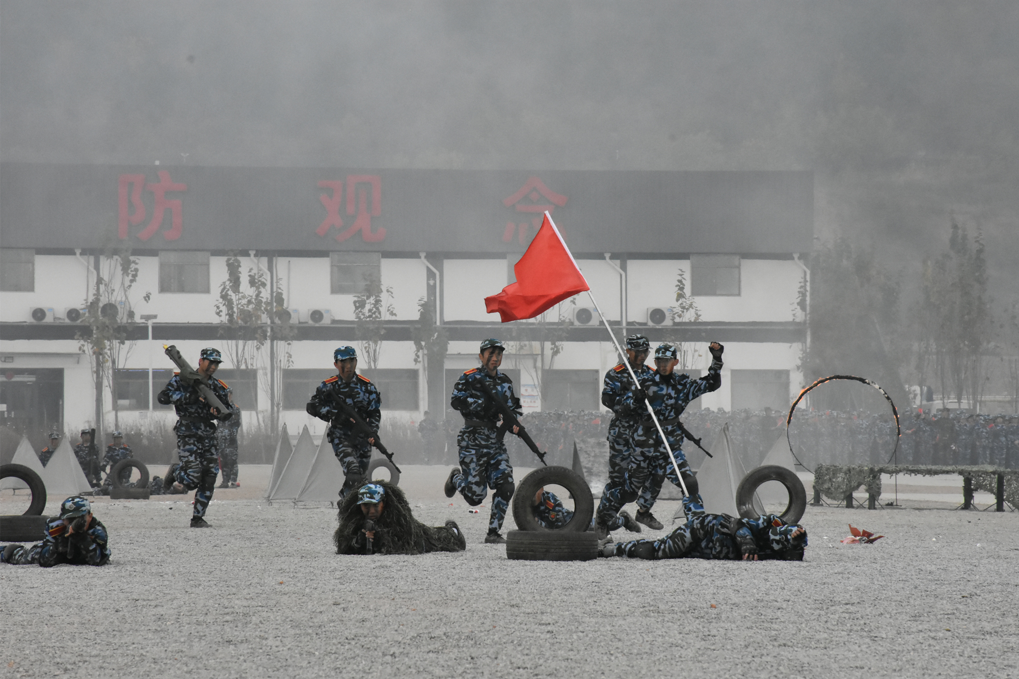 闭营仪式的分列式表演环节中,2021级1500余名学生组成15个方阵,迈着整齐矫健的步伐依次通过主席台。他们英姿飒爽、威武豪迈,洪亮的口号声响彻阅兵场,充分展现了我校学子青春激昂、意气风发的精神风貌。在军体拳、匕首操、擒敌拳、刺杀操、海军旗语的军事科目表演中,他们用整齐划一的动作、刚劲有力的口号、行云流水的表演完美展示了本次训练成果。最后出场的战术小队是我校首次进行的训练科目。队员们手握钢枪、面涂迷彩、身着伪装衣,在音效和烟雾弹构建的“枪林弹雨”中熟练穿梭,完成了各项任务。精彩的表演赢得了在场师生阵阵热烈掌声和欢呼声。