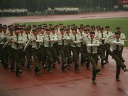 闭营仪式首先进行阅兵式表演,颜辉书记在雄壮的军乐声中依次检阅了军训方队,军训团李团长和政委袁文清陪同检阅。在分列式表演中,2010级新生军训方阵迈着整齐的步伐,高喊响亮的口号,正步通过主席台,充分展现了良好的训练成果和朝气蓬勃的精神风貌。虽然秋雨绵绵,透着丝丝凉意,但同学们却顶着秋风细雨,以饱满的热情和昂扬的斗志,坚持完成了分列式表演,他们顽强的毅力和出色的表演,赢得了领导和老师们的阵阵掌声。在随后的军训科目汇报表演中,军体拳和养成教育团体操依次进行了展示,同学们整齐划一的步伐、刚劲有力的动作,震憾了整个体育场。