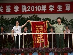 之后,军训团政委袁文清宣读了关于2010年秋季学生军训训练标兵和优秀学员的表彰决定。2010级劳动关系系孙鹤同学代表参训学生发言。军训团李团长做军训闭营总结。 随后,张晓波副书记向承训部队赠送锦旗。