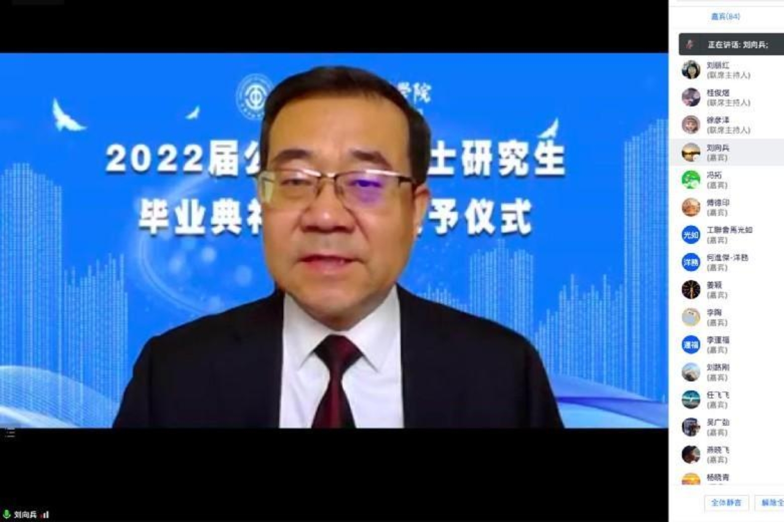 刘向兵书记代表学校向圆满完成学业的61名研究生毕业生表示最热烈的祝贺,向默默支持MPA研究生完成学业的家属亲友们、关心支持学校事业发展的社会各界人士表示最衷心的感谢,并为面对严峻复杂的疫情环境、克服种种困难坚持完成学业的毕业生点赞。他希望正值奋发向上、青春年华的毕业生,一是要永葆报国志向,以爱国情怀引领成才理想,始终把个人奋斗融入到党和人民事业中,牢记我校“立德守正、崇劳创新”的使命,以公共管理学人强烈的担当精神,勇挑重担,积极作为,与新时代同向同行;二是要永葆劳动情怀,以实践行动铺就成才之路,始终保持劳动创造的火热激情、始终牢记劳动创造幸福的朴素真理、始终怀有尊重劳动人民的真挚情感,始终践行总书记一向倡导的“实干兴邦”的劳动精神;三是要永葆卓越追求,以奋斗品格担当青年先锋,敢于向困难挑战、给自我加压,在劈波斩浪中开拓前进,在披荆斩棘中一往无前,在攻坚克难中创造业绩,用青春和汗水创造出让人刮目相看的先锋业绩、卓越奇迹。