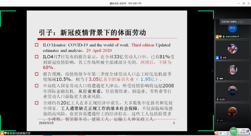 5月15日下午,学校2019—2020学年研究生“名家讲坛”系列讲座第四讲在云端开讲。劳动关系与人力资源学院林燕玲教授以《体面劳动——世界与中国》为题进行专题讲座,讲座由研究生处副处长赵莹主持,学校70余名师生以视频会议形式聆听了讲座。