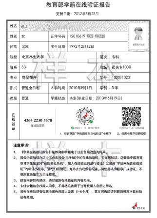 《教育部学籍在线验证报告》和《教育部学历证书电子注册备案表》样例: