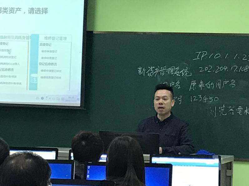会上普诺迪软件研发公司的技术总监、北京化工大学信息学院教授杨立国老师,对新“资产管理信息系统”、微信公众号、资产管理APP以及资产一体打印机进行了业务培训,就资产采购、资产登记、使用管理、信息变动、资产调配、资产处置、资产查询、资产盘点和资产信息统计等功能模块进行了演示讲解,资产管理员通过系统账户登录和软件功能进行了应用操作。