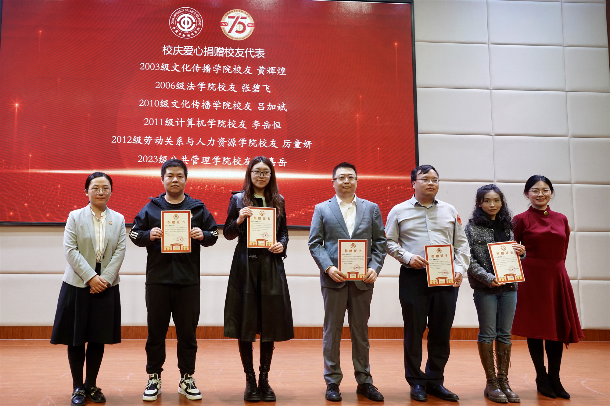 During the anniversary celebration period, CULR has opened channels for small amount donation and dedicated donation, receiving strong support from alumni. The secretary general and deputy secretary general of the university foundation presented certificates to Li Tongyan and other small amount donators, commending their support for the flood control and disaster relief by CULR Zhuozhou campus in the summer of 2023. CULR also held a belated special commendation ceremony to present certificates to Xu Xiaoqiang and other donating alumni, and a collective certificate to the model laborer alumni association.