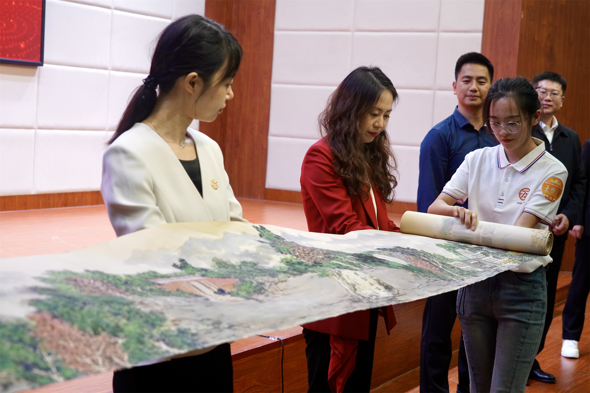 During the anniversary celebration, CULR alumni from all over the world sent best wishes to the alma mater and teachers in various forms such as singing of the university anthem, congratulatory audio and video, and gifts. At the conference, Ning Yunzhan, a 2022 model laborer alumnus, presented the exquisite calligraphy work of Stories of Labor to the alma mater; the School of Public Administration presented a long scroll painting Spring Flowers and Autumn Fruits; the alumni of 1987 class of labor movement history of the School of Trade Union presented a large porcelain vase; the alumni representatives presented flowers to retired teachers.