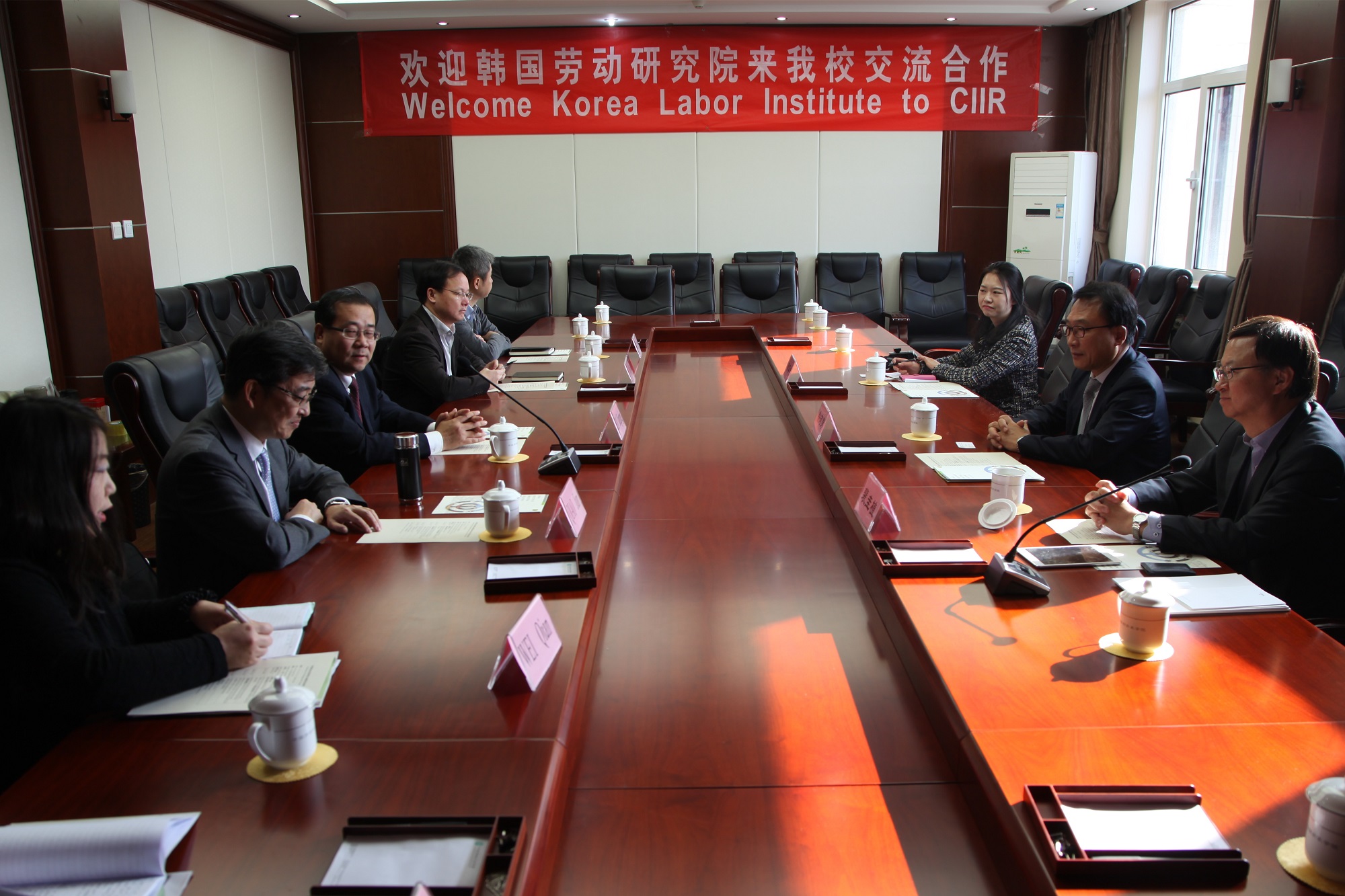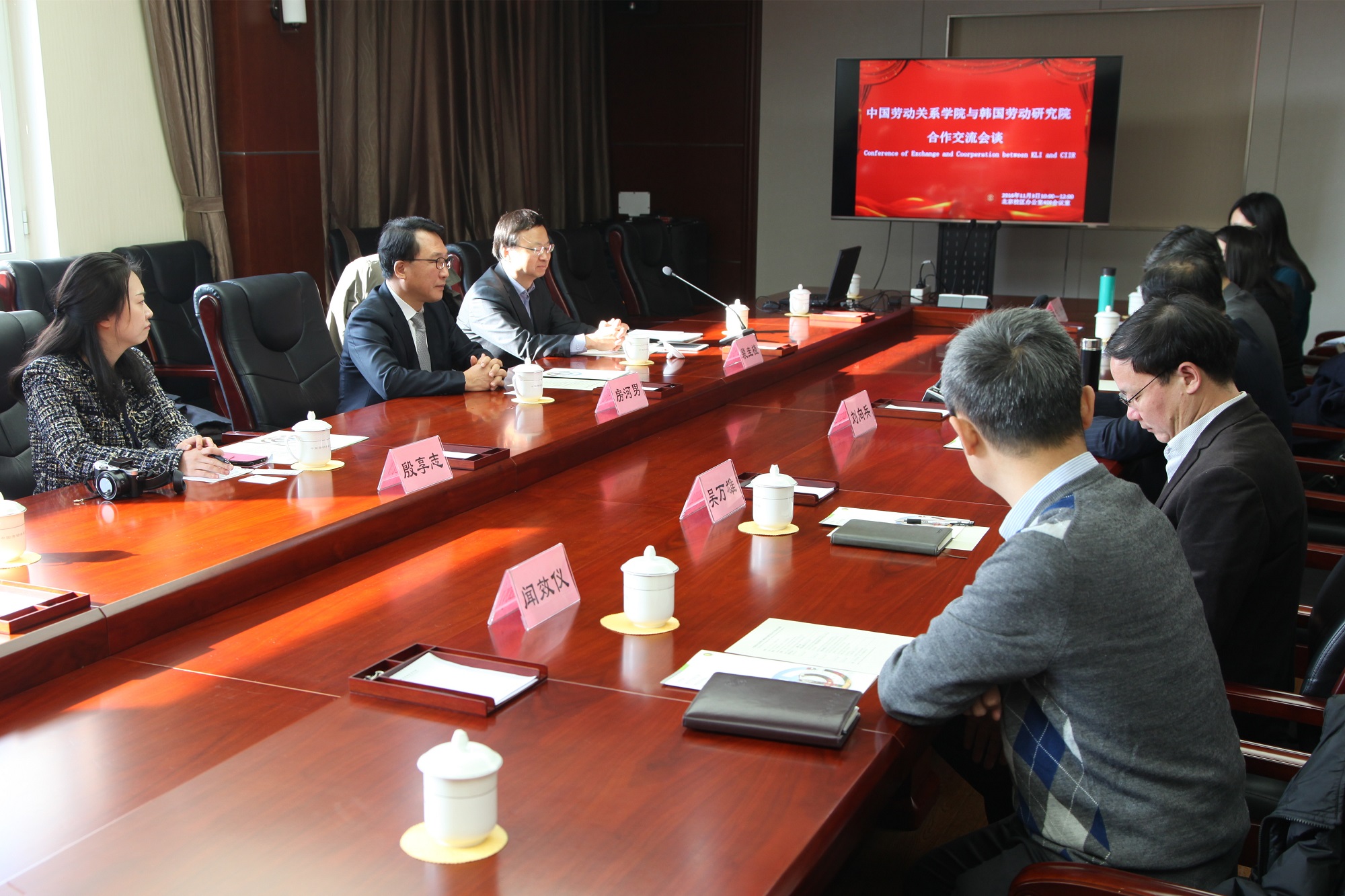 On the morning of November 3, in the conference room on the fourth floor of the office building of the Beijing Campus, the President Bang Ha-nam of the Korea Labor Institute (KLI), Senior Researcher Kiu Sik Bae, and Assistant Yoon Hyang-ji of KLI's Foreign Affairs Office visited our university for exchange. President Liu Xiangbing and Vice President Wu Wanxiong, together with Director Qiao Jian, Vice Director Wen Xiaoyi, and teachers Wang Xiao and Wei Qian of the School of Labor Relations and Human Resources, received the delegation led by the KLI President, and the two sides had frank, friendly and fruitful talks and exchanges. The meeting was chaired by Qiao Jian, Director of the School of Labor Relations and Human Resources.、