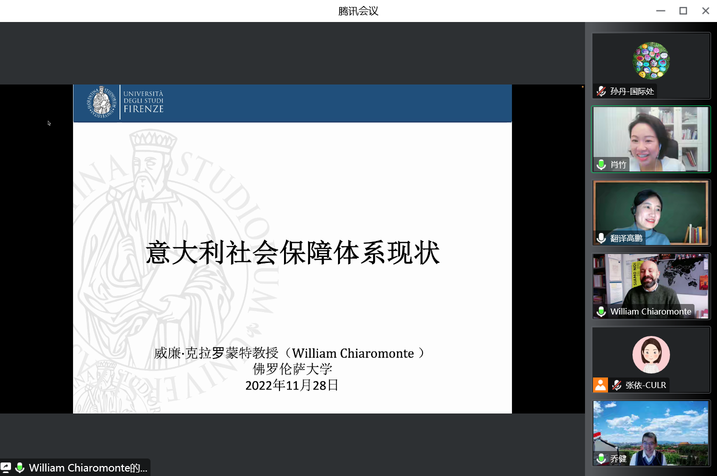 In the consultation session, Professor Xiao Zhu, Executive Dean of the Law School of the CULR commented that the wonderful presentation of Associate Professor William Chiaromonte gave a basic picture of Italy's social security system. The CULR's Law School and the Faculty of Law of the University of Florence signed a cooperation agreement in 2021, establishing a preliminary cooperative framework for exchanges of teachers, students, and academic views between the two universities. She looked forward to further intercollegiate exchanges and cooperation. Professor Xiao Zhu then introduced the big picture of China's social security and relevant issues. She said that the Chinese path to modernization proposed in the report to the 20th National Congress of the CPC is to achieve common prosperity for all, and common prosperity is the essential requirement of socialism with Chinese characteristics. The most important task of China's social security system is to give peace and comfort to the people, which underlined putting the people in the first place and achieving common prosperity, and sets improving the people's well-being and promoting social equity as the inspiration and cornerstone of China's social security undertakings, allowing more benefits from the reform and development to be more equally shared by all people. She briefed the present status of China's social security system and mentioned some existing issues, e.g. the effect of population aging on the sustainability of pension insurance, and a low proportion of pension insurance for flexible employees. She believed that Italy's new social relief measure in response to economic regression and the global pandemic is worthy of reference to China, and reciprocally China's recent pilot program of occupational injury security for employees of new business forms also has reference value for Italy.