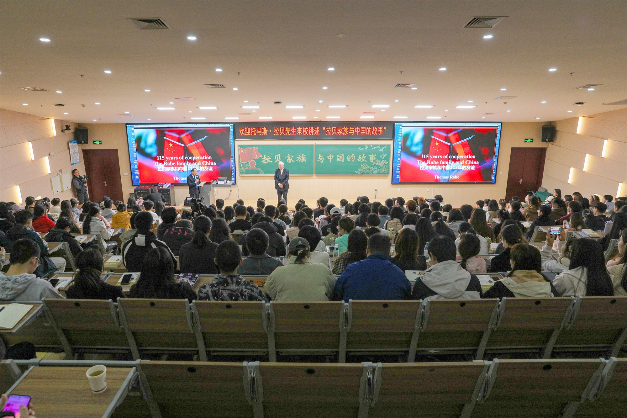 Following that, Mr. Thomas Rabe presented a compelling lecture named The Story of the Rabe Family and China in Conference Hall 105 of the Zhiyuan Building. More than 300 faculty and student representatives from CULR attended the lecture. The lecture was chaired by Director Li Dong.
