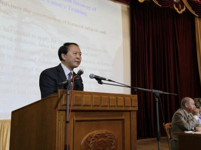 During the visit to Russia, the delegation attended an international academic seminar on the theme of "Vocational Training, Labor Mobility, and Labor Force Transfer" hosted by the ATISO. President Li Deqi delivered a keynote speech titled "Union Training Strategies and Quality Assurance at the China University of Labor Relations," which was highly praised by representatives from various countries in attendance. During the conference, the delegation also exchanged views with leaders and experts from union schools in Ukraine, Greece, Vietnam, Mongolia, Belarus, and other countries. The delegation also held discussions with the President and other key leaders of the ATISO on future academic exchanges between the twouniversities.