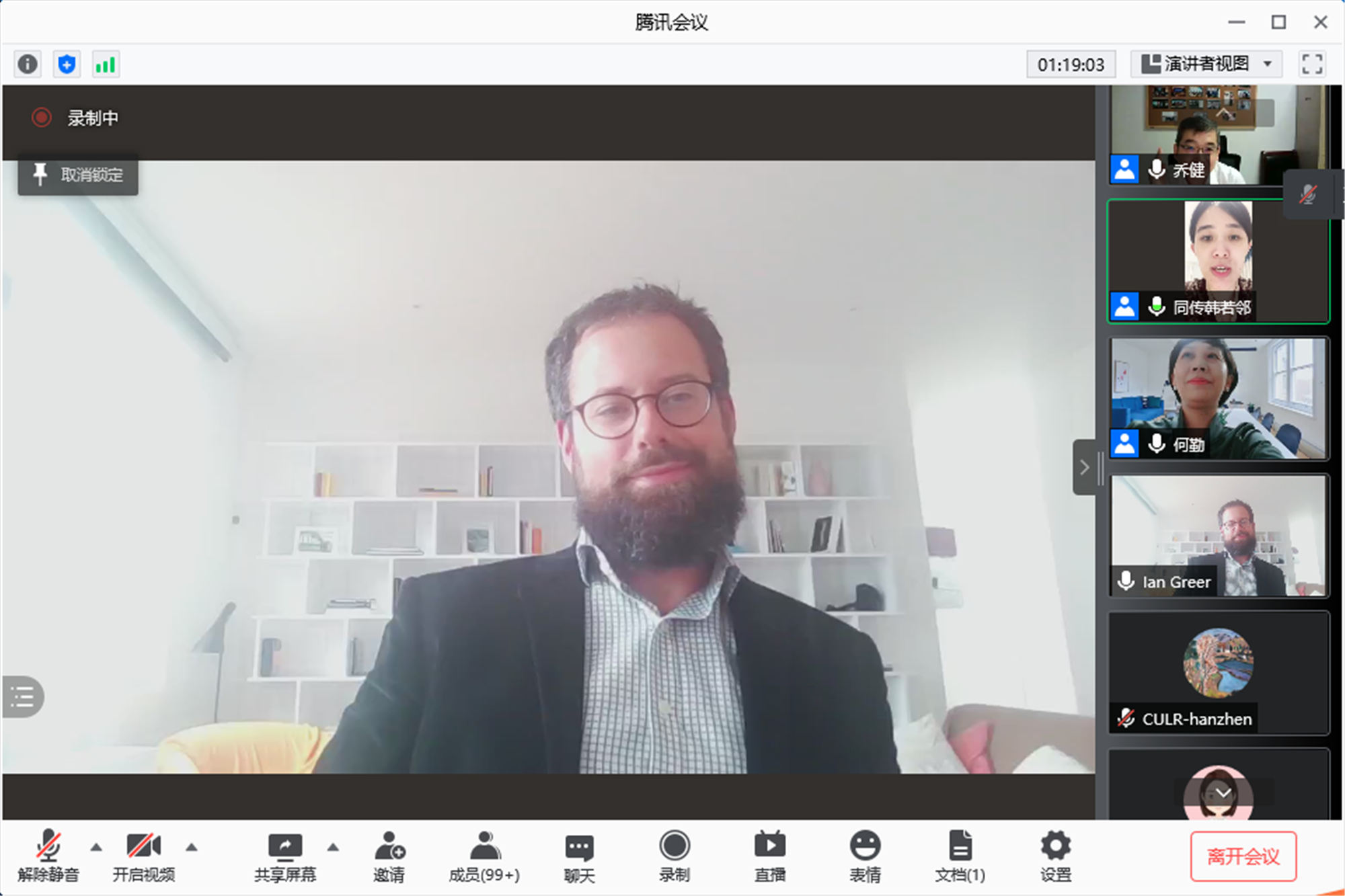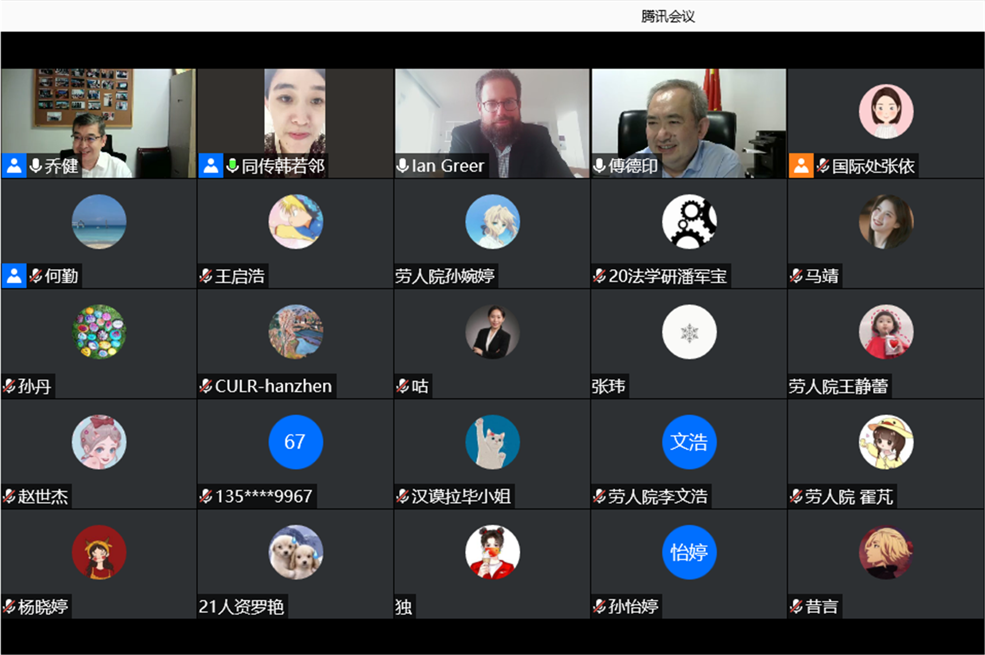 On September 28, the seventh lecture of “2021 Series of Lectures on Global Labor Market Flexibilization and Digital Economy Employment Regulation”, hosted by the CULR and co-organized by the Labor Relations Branch of Chinese Association of Human Resource Development, was held online. Dr. Ian Greer, Director of the Joint Laboratory of Industrial and Labor Relations at Cornell University in the United States, was invited as the keynote speaker and delivered a presentation titled "Can Gig Workers Receive Unemployment Benefits? A Case Study of the United States During the Pandemic". Fu Deyin, Deputy Secretary of the Party Committee and President of the CULR, attended the lecture, with more than 190 experts, scholars, and students from inside and outside the CULR listening online.