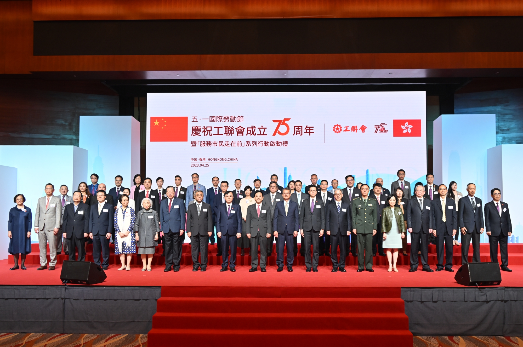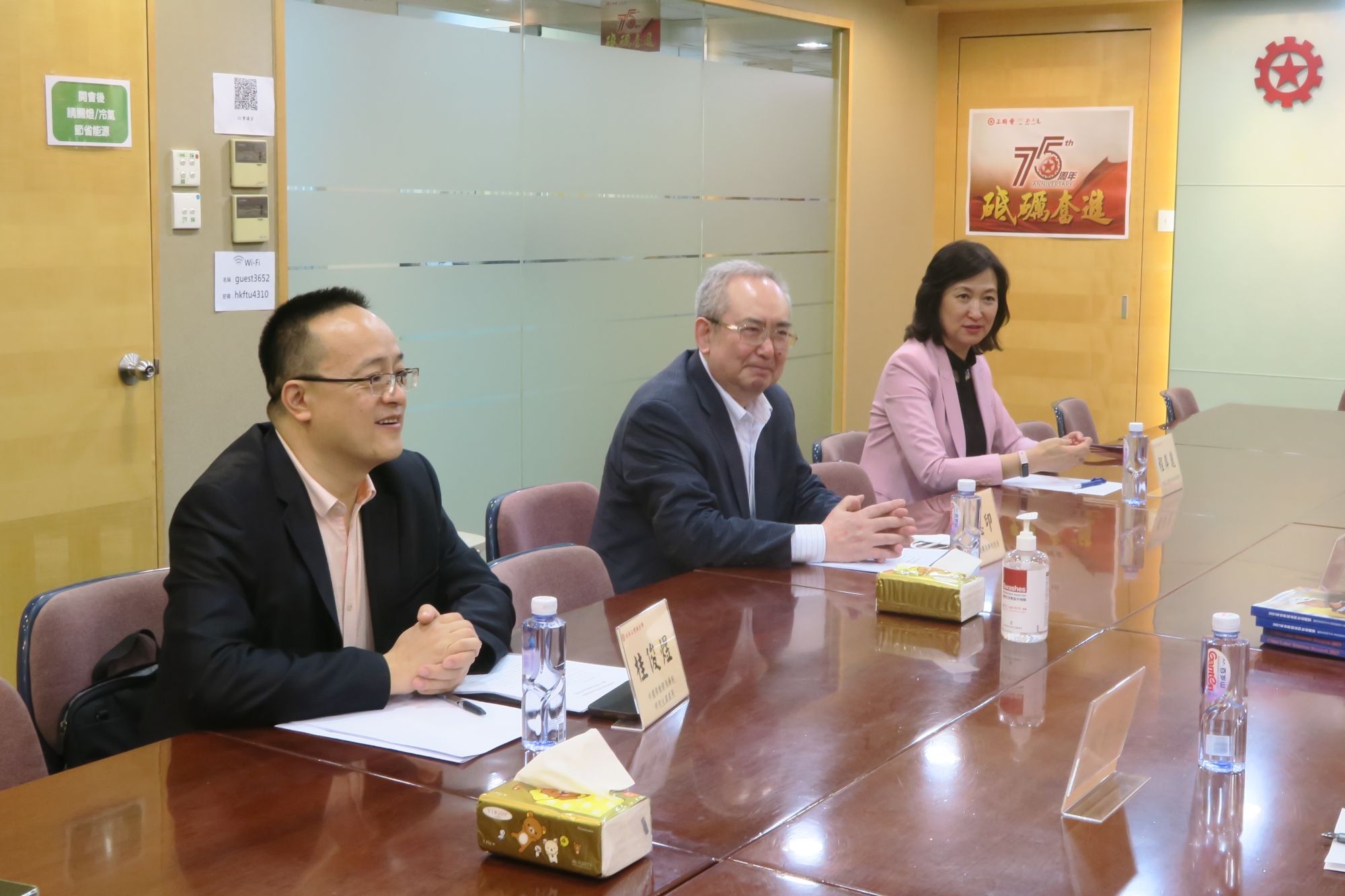 From April 24 to 26, President Fu Deyin and his delegation were invited to attend the 75th anniversary celebration of the Hong Kong Federation of Trade Unions (HKFTU), and had discussions with the HKFTU and graduate students in Hong Kong Special Adiministrative Region. President Fu Deyin and his delegation were received by President Ng Chau Pei and Chairman Kingsley Wong Kwok of the HKFTU. The 75th anniversary celebration of the HKFTU invited more than 1,000 participants from government departments and various sectors of society. On the day of the celebration, President Fu Deyin was invited to the first row of the rostrum for a toast. The head of the Graduate School accompanied the delegation to the celebration event.