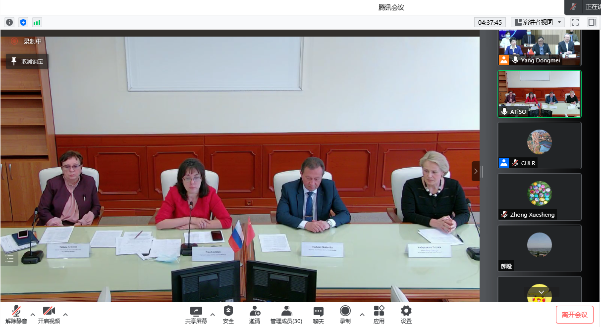 Vice President Wu Wanxiong said in the concluding remark that this seminar is a successful academic exchange activity via video link between the two trade union universities in China and Russia during the pandemic period. The ATISO is one of the CULR's earliest overseas partners, and the two universities have quite a few similarities in educational position, teaching characteristics, background of trade union and mission of union cadres training, which serve as a solid foundation of the friendly and cooperative relationship in a long run. He hoped that in the future the two universities would continue communication and dialogue, keep exploring new fields of collaboration and make new achievements.