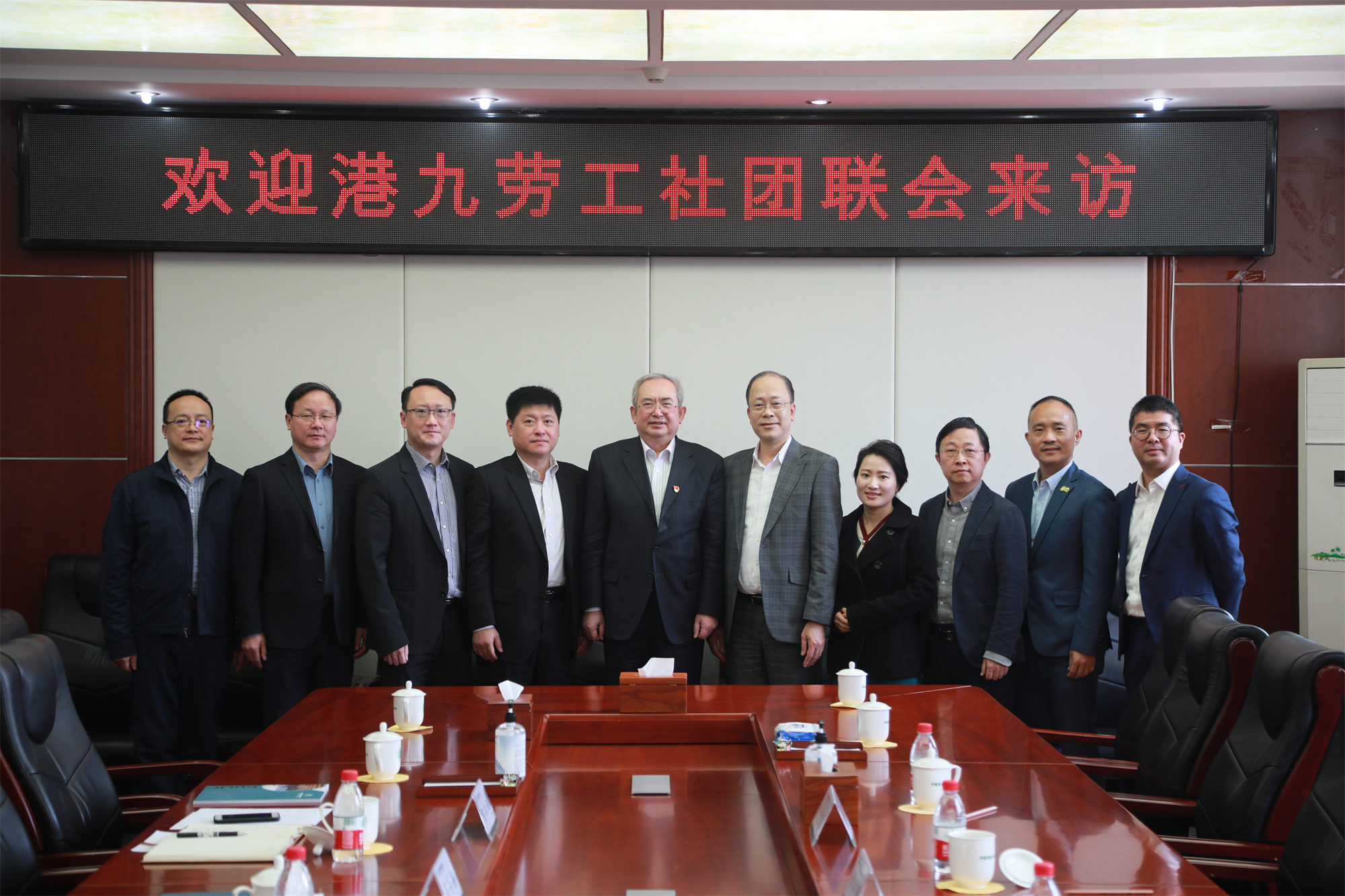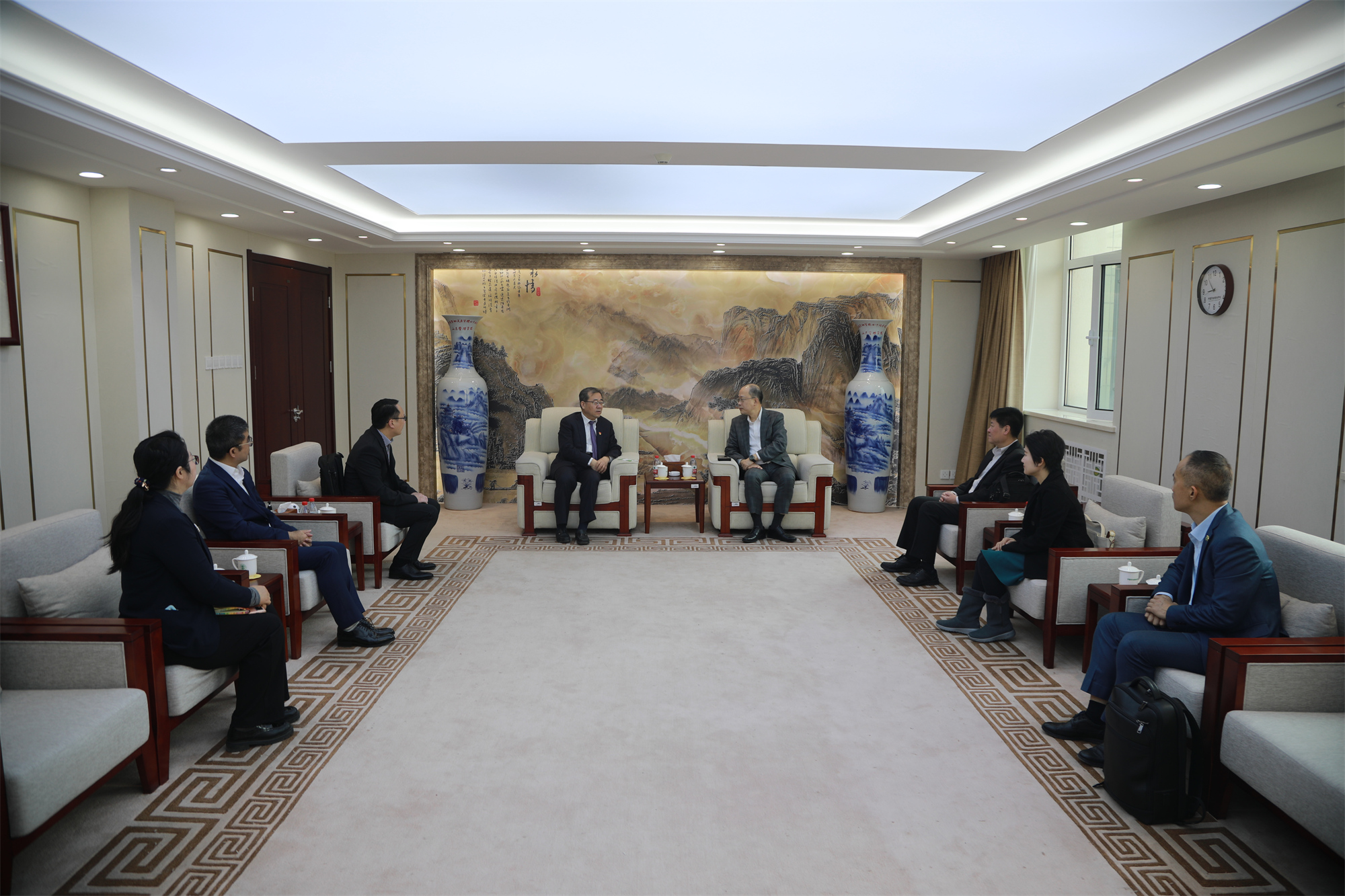On the morning of March 31, a delegation of 6 people led by Chau Siu-chung, Secretary-General of the Federation of Hong Kong and Kowloon Labour Unions (HKFLU), and Zhou Wei, Deputy Director of the Social Work Department of the Liaison Office of the Central People's Government in the Hong Kong Special Administrative Region, came to the Beijing campus for a friendly visit. Liu Xiangbing, Secretary of the Party Committee of our university, met with Secretary-General Chau Siu-chung and his delegation in the VIP room.