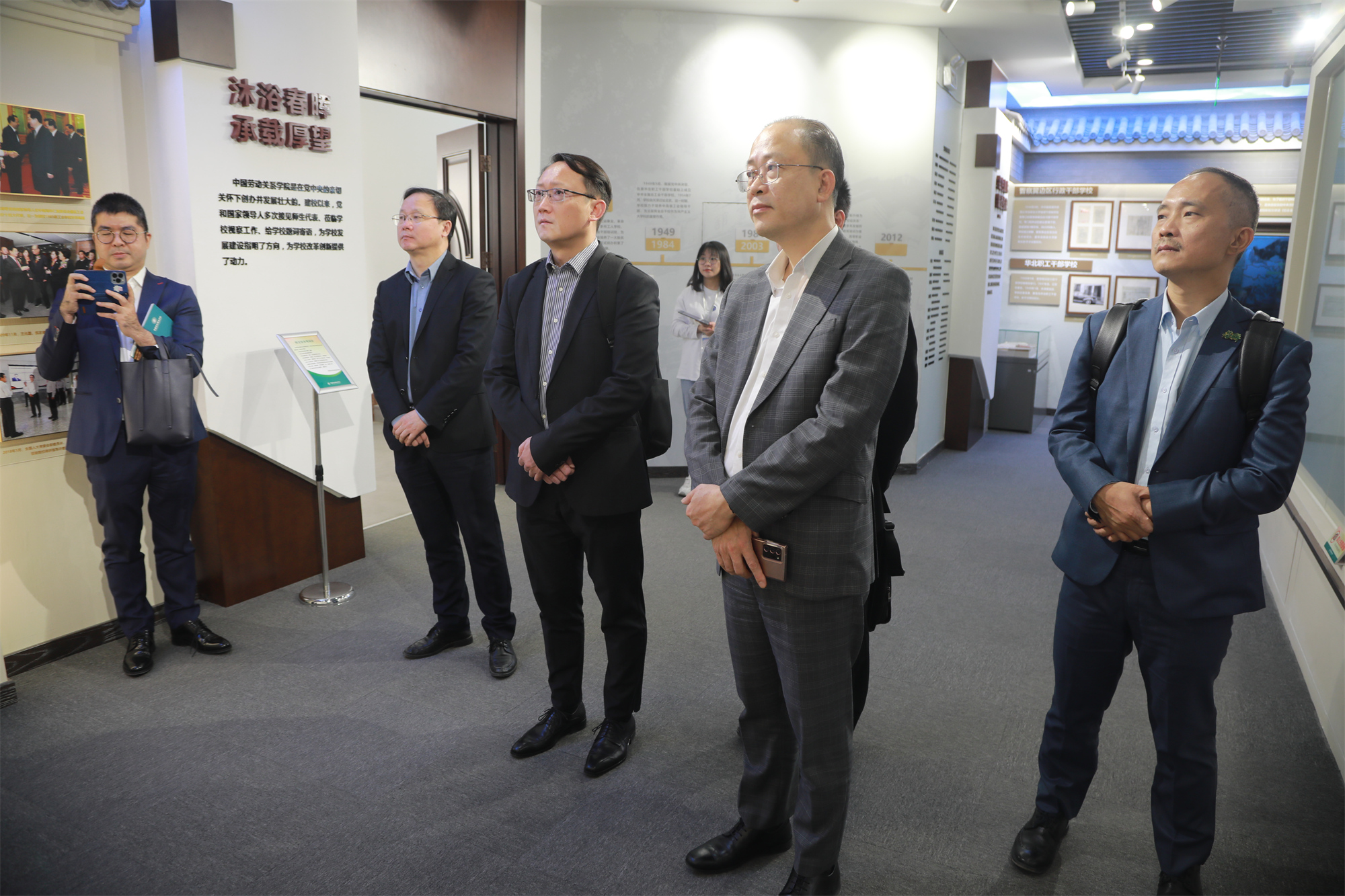 After the meeting, Secretary-General Chau Siu-chung, Deputy Director Zhou Wei, and their delegation visited the theme exhibition "The New Era is Achieved through Hard Work" - our university's exhibition on studying and implementing the spirit of General Secretary Xi Jinping's reply letter and the university history museum.