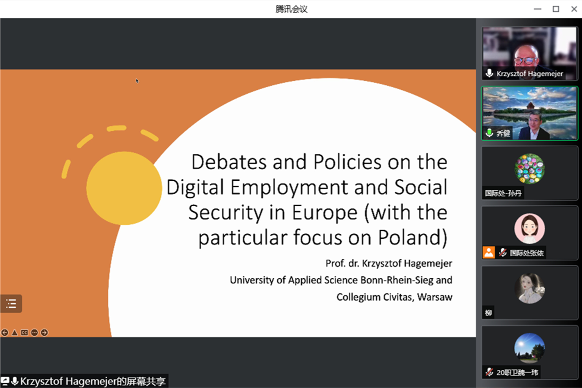 On the evening of May 17, the second lecture of "2022 Global Flexible Employment Era and Expanding Social Protection Serial Lectures" was held online, which was organized by the CULR and co-organized by the Labor Relations Branch of the Chinese Association of Human Resource Development. Professor Krzysztof Hagemejer from the University of Applied Science Bonn-Rhein-Seig was invited to make a presentation titled Debates and Policies on the Digital Employment and Social Security in Europe (with the particular focus on Poland). The lecture was attended by Professor Fu Deyin, Deputy Secretary of the Party Committee and President of the CULR and Professor Feng Xiliang, President of the Labor Relations Branch of the Chinese Association of Human Resource Development, as well as more than 190 scholars, experts, teachers and students inside and outside the CULR.