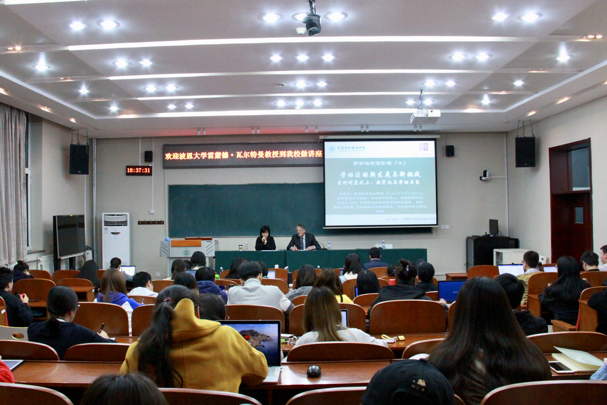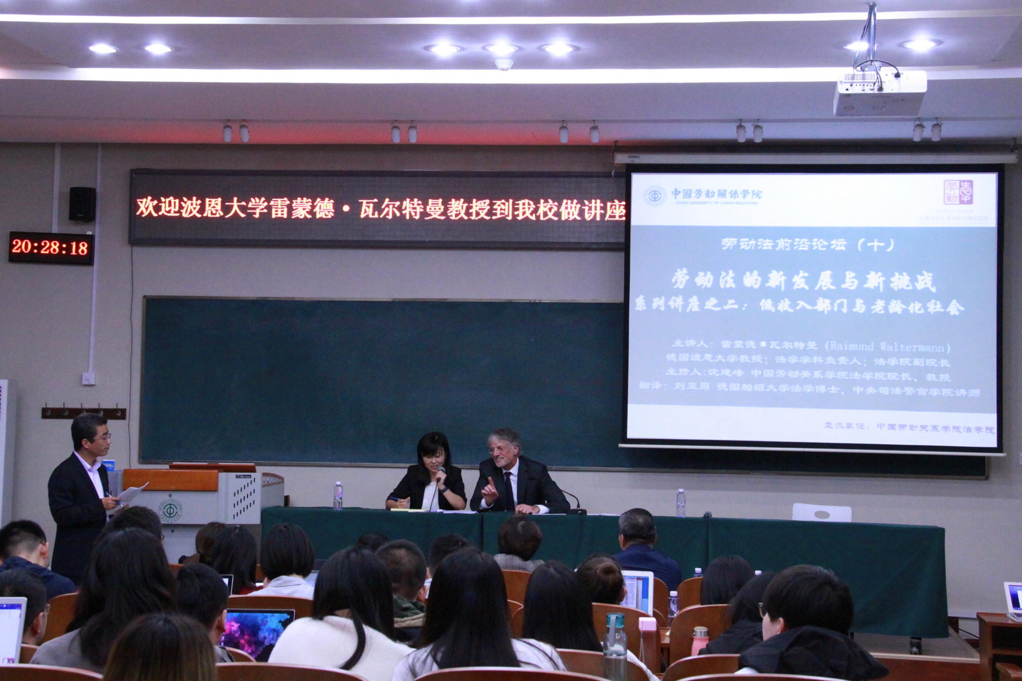 Professor Raimund Waltermann, associate dean and also head of the University of Bonn Law School, was invited to hold the special lecture for the 70th anniversary of China University of Labor Relations and the Labor Law Frontier Forum Series 10 on “New Progress and Challenges in the Labor Law” during October 12 to 16. The lecture was held in the First Terrace Classroom of Wendao Building and was also broadcast live in the Eighth Terrace Classroom on Zhuozhou Campus by means of remote audio-visual equipment. More than 120 people, including professionals from outside academia and practice circles, teaching staff, students and alumni of the university attended the lecture. All seats were occupied and the audience was enthusiastic.