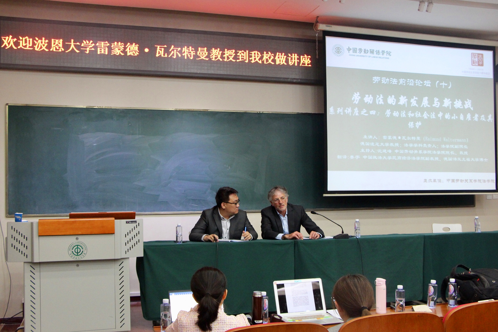 The lecture was interpreted by Dr. Ding Wanjing, a teacher from the China University of Labor Relations Law School, Associate Professor Lou Yu, director of the Institute for Social Law of the Department of Civil and Commercial Law and Economic Law from China University of Political Science and Law and Dr. Liu Ya’nan from National Police University for Criminal Justice. Other professionals also attended the lecture and had an in-depth discussion with Professor Waltermann, including Professor Xie Zengyi from the Institute of Law of Chinese Academy of Social Sciences, vice president of the China Law Society Social Law Studies Institute, Professor Feng Yanjun from the Jilin University Law School, vice president of the China Law Society Social Law Studies Institute, Professor Yu Shuhong from the Wuhan University Law School, vice president of the Labour Law Branch of the China Law Society Social Law Studies Institute, Liu Fashe, president of Sanya Labour and Public Personnel Dispute Arbitration Court in Hainan Province and Professor Jiang Ying, member of the standing committee of the party committee and director of the academic affairs office of China University of Labor Relations.