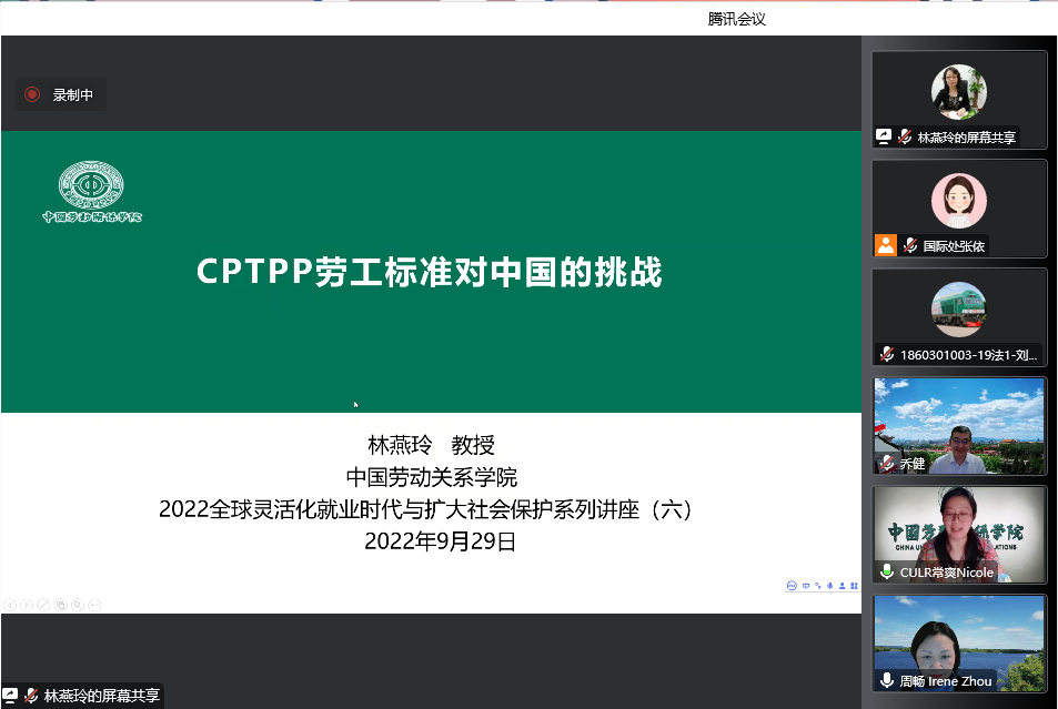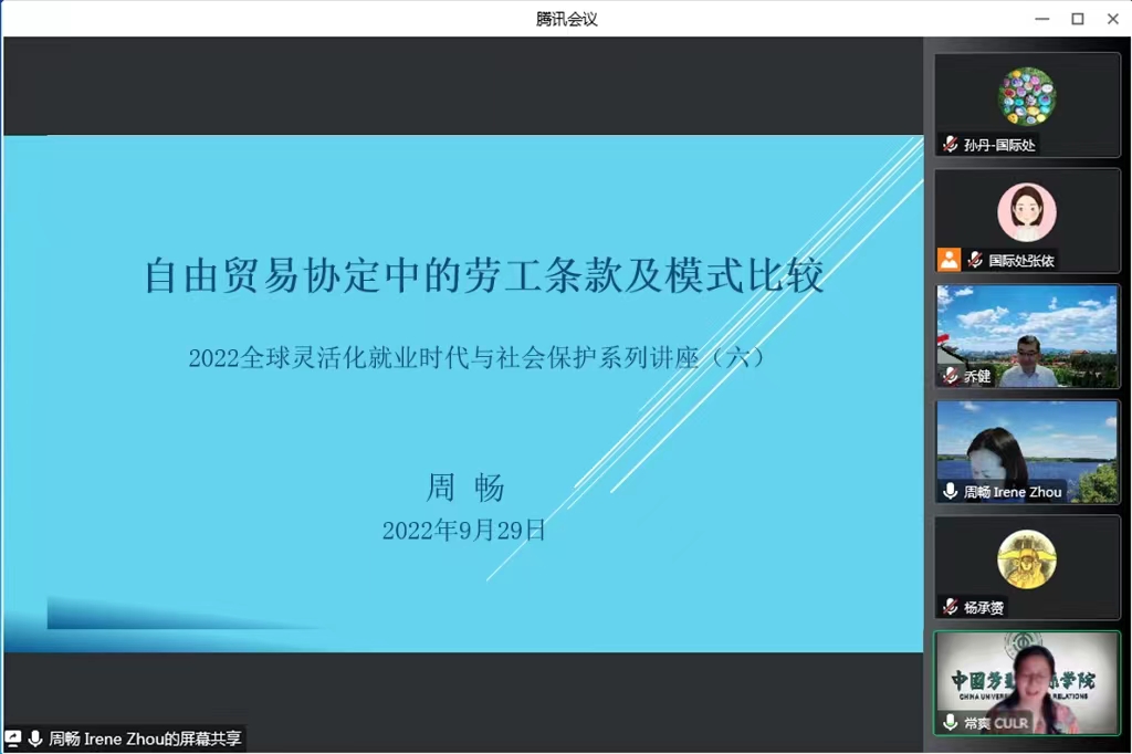 On September 29, the sixth lecture of "2022 Global Flexible Employment Era and Expanding Social Protection Serial Lectures" was held online, which was organized by the CULR and co-organized by the Labor Relations Branch of the Chinese Association of Human Resource Development. Centered on the theme of "Labor Clauses in International Trade Agreements: International vs. China", Ms. Irene Zhou, former Expert on Labor Law from the ILO China and Mongolia Bureau and Professor Lin Yanling from the CULR made presentations titled Comparison of Labor Clauses and Models in Free Trade Agreements and Challenges of CPTPP Labor Standards to China respectively. More than 210 scholars, experts, teachers and students inside and outside the CULR listened online.